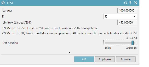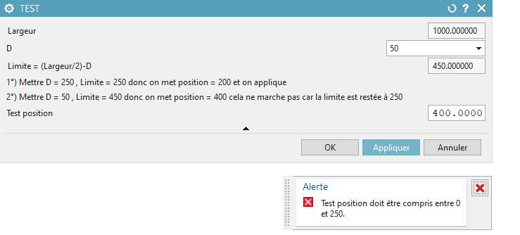 Puis j’utilise, toujours dans la PTS, une autre expression TOTO , en saisie simple, donc que je renseigne. J’ai fixé des limites d’utilisation dont une, la valeur max, qui dépend de l’expression LIMITE.